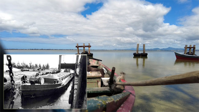 O nome, nada original da praia, esconde mais de 50 anos de extração de conchas e matéria orgânica dos fundos da lagoa pela Álcalis (1953 – 2006). As estacas com pneus serviam de atracadouro das barcaças que faziam a dragagem dos sedimentos para produção de cal e barrilha. No local também era retirado sal. Ainda hoje é possível ver o desenho das quadras de secagem do sal, que aos poucos vem sendo coberto pela vegetação.